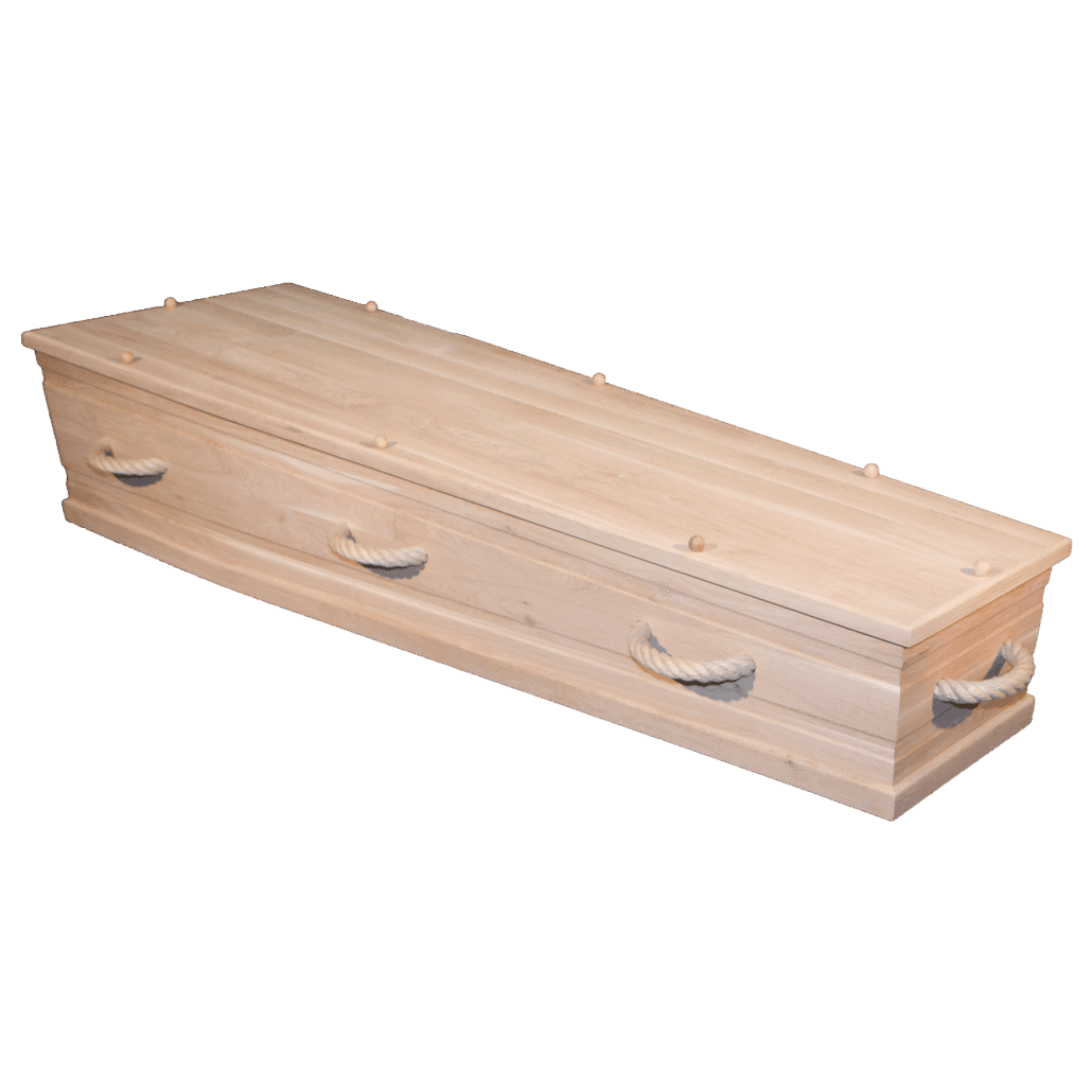 U heeft bij dit model de keuze uit handgrepen van massief hout of touw. Deze kist is voorzien van een bekleding van katoenen capitonnage, is omrand met een koord en volant, ( strook bekleding dat over de rand van de kist valt) en wordt geleverd met deken en kussen.