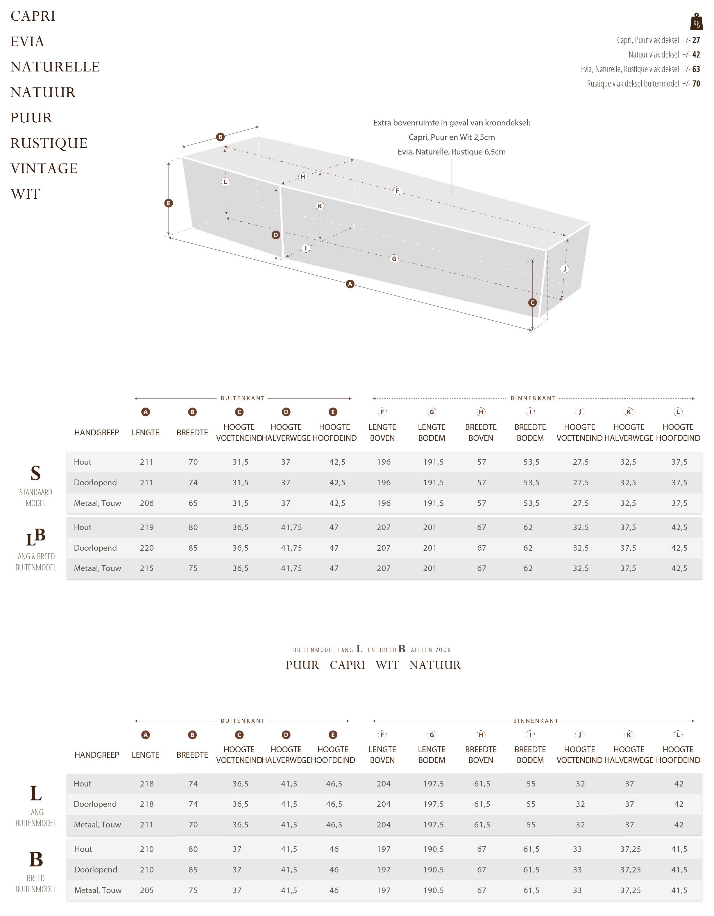 Di model is voorzien van handgrepen van massief hout. U heeft bij dit model ook de keuze uit handgrepen van scheepstouw (zie model Natuur NA-12). Het door ons gebruikte touw is echt scheepstouw wat robuust aanvoelt, niet in de handen snijdt en een goede houwvast biedt. Dit model is ook verkrijgbaar met de unieke doorlopende houten handgrepen, die als een cirkel rondom de kist bevestigd zijn (zie model Natuur NA-11). Met deze handgrepen is het mogelijk is om de kist met meer dan drie personen per zijkant te dragen. Deze kist is voorzien van een zachte katoenen bekleding omrand met een koord en volant, (strook bekleding die over de rand van de kist valt) en wordt geleverd met deken en kussen.